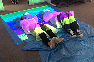 日常のモヤモヤを かっぱを着た相手の背中にぶつける。背中にはスティックのりでもやもやを描き カラーセロファンが広がった空間に背中からダイブする。もやもやは暗号化され アートとして還元される。