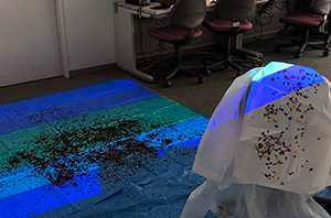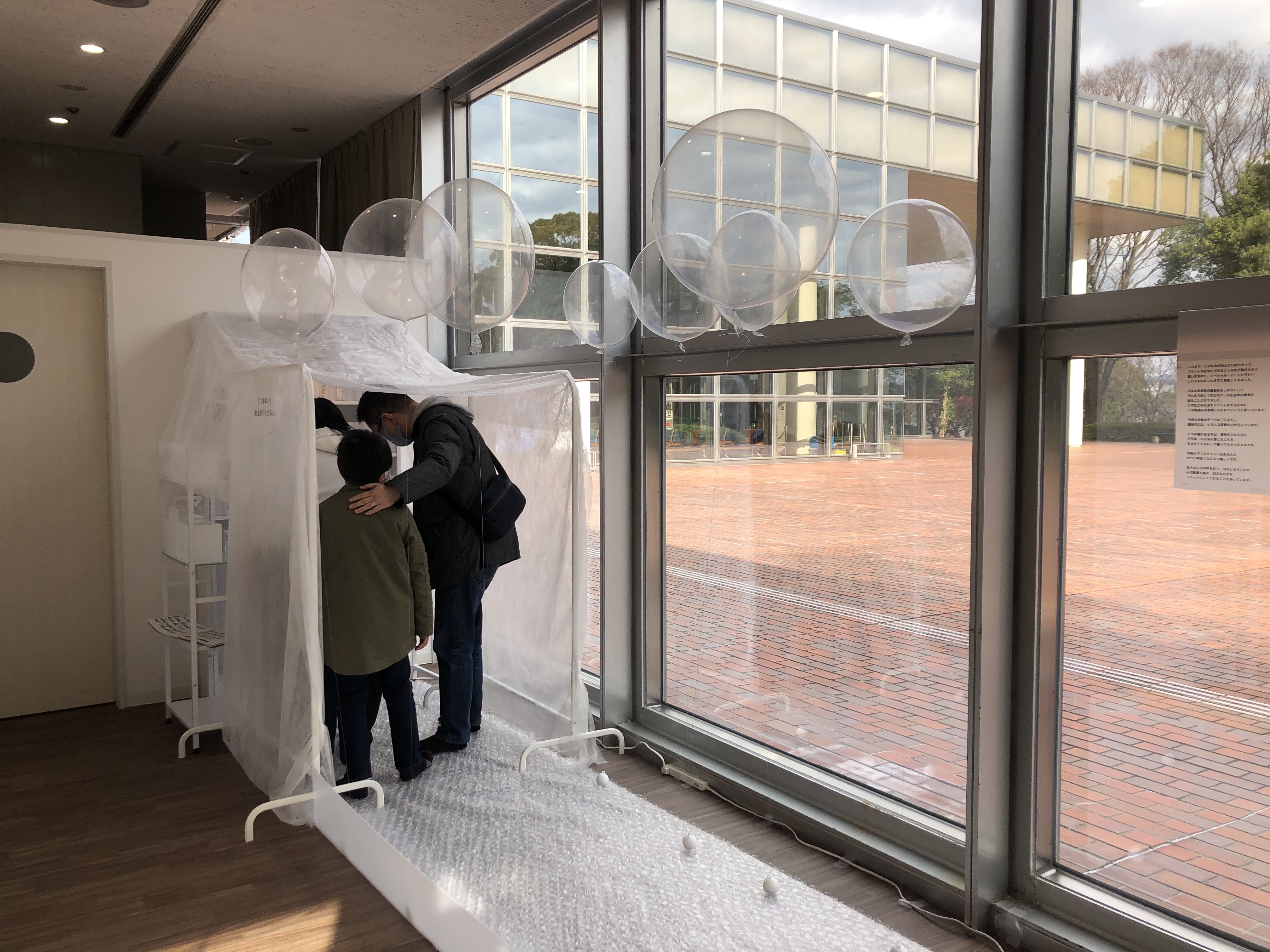 床にはプチプチが引かれており、来場者が踏んでいくことで少しずつ平らになっていく。