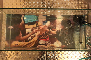 現代社会の凹凸さを様々なメタファーを用いて表現。水槽とピアニカは、水槽の中に フラットでないものを入れると、「フラットになる」という仕組み。和室をモチーフにしており「にじり口」をくぐると上下関係がなくなる効果を用いている。以下のうち、どれが本当の意味の「フラット」なのだろう?