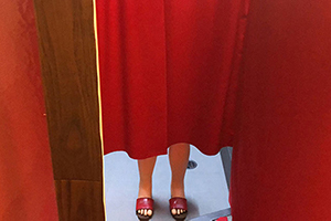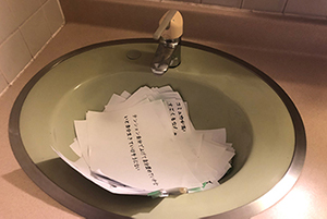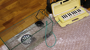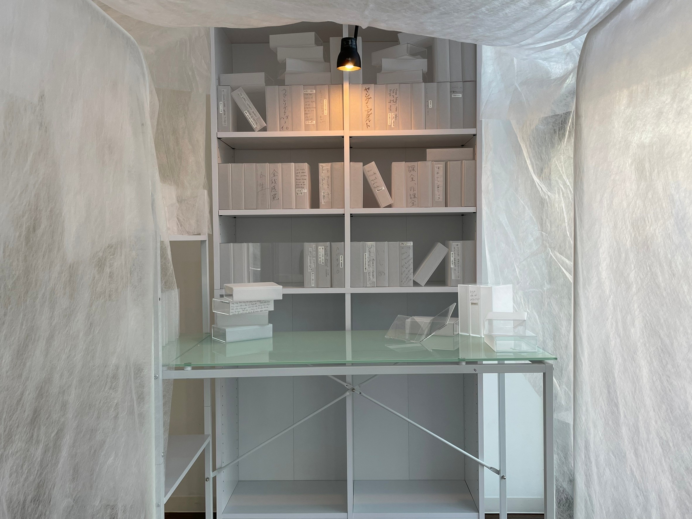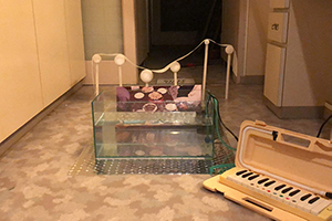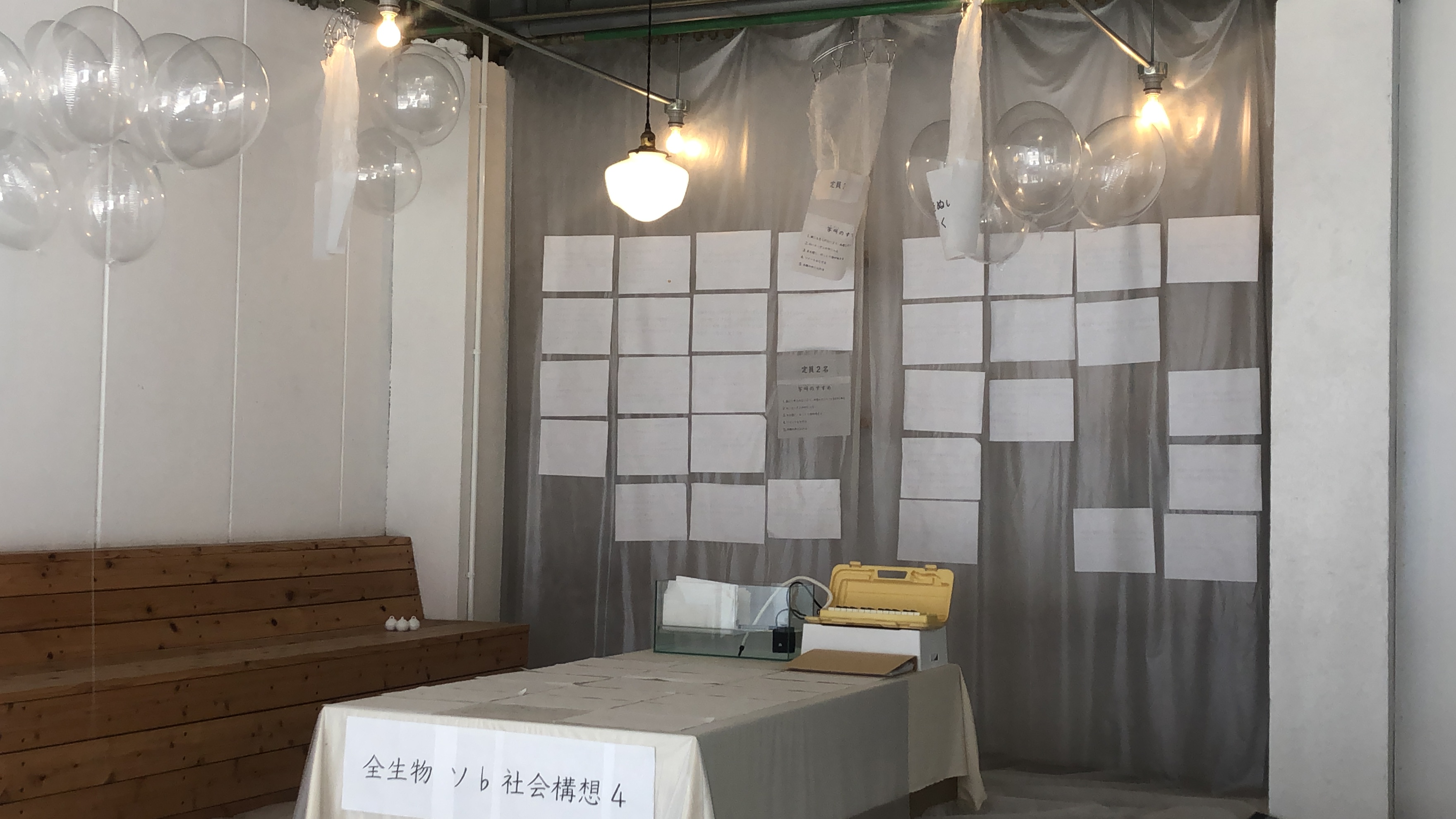 机と不透明なカーテンに一面に貼られているのは、写叫用紙(ツイッターで、「自分」という言葉を含んだツイートを持ってきたもの)。この中から、共感した写叫用紙を手に取る。これを写経のように、カーテンの中の部屋で正座になって、文字をなぞる。なぞった用紙は、水槽の中へ入れて浄化される仕組み。水槽へはピアニカが繋がっており、ピアニカからは「ソ♭」の音が流れている。「ソ」ーシャル・アートセラピーによって「♭(フラット)」な社会になりますように。という意味の音階である。