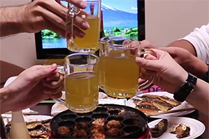現代社会の凹凸さを様々なメタファーを用いて表現。ここでは特に乾杯の際の上下関係を解決する方法を示している。