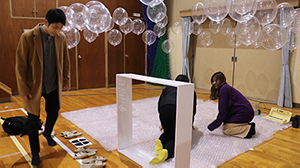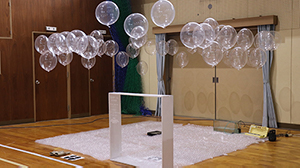 空間全体にはふわふわと透明な風船が浮かんでおり、上下関係がはっきりしすぎない社会を表現。
