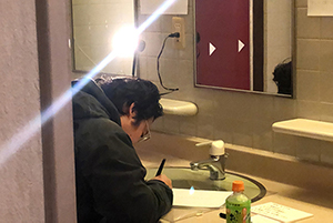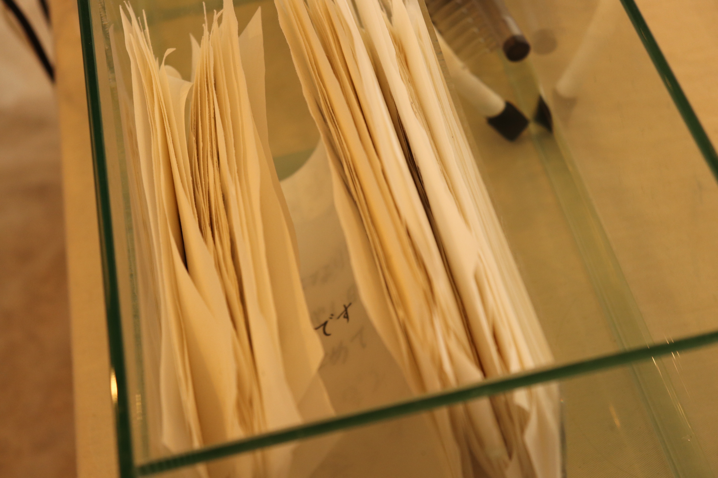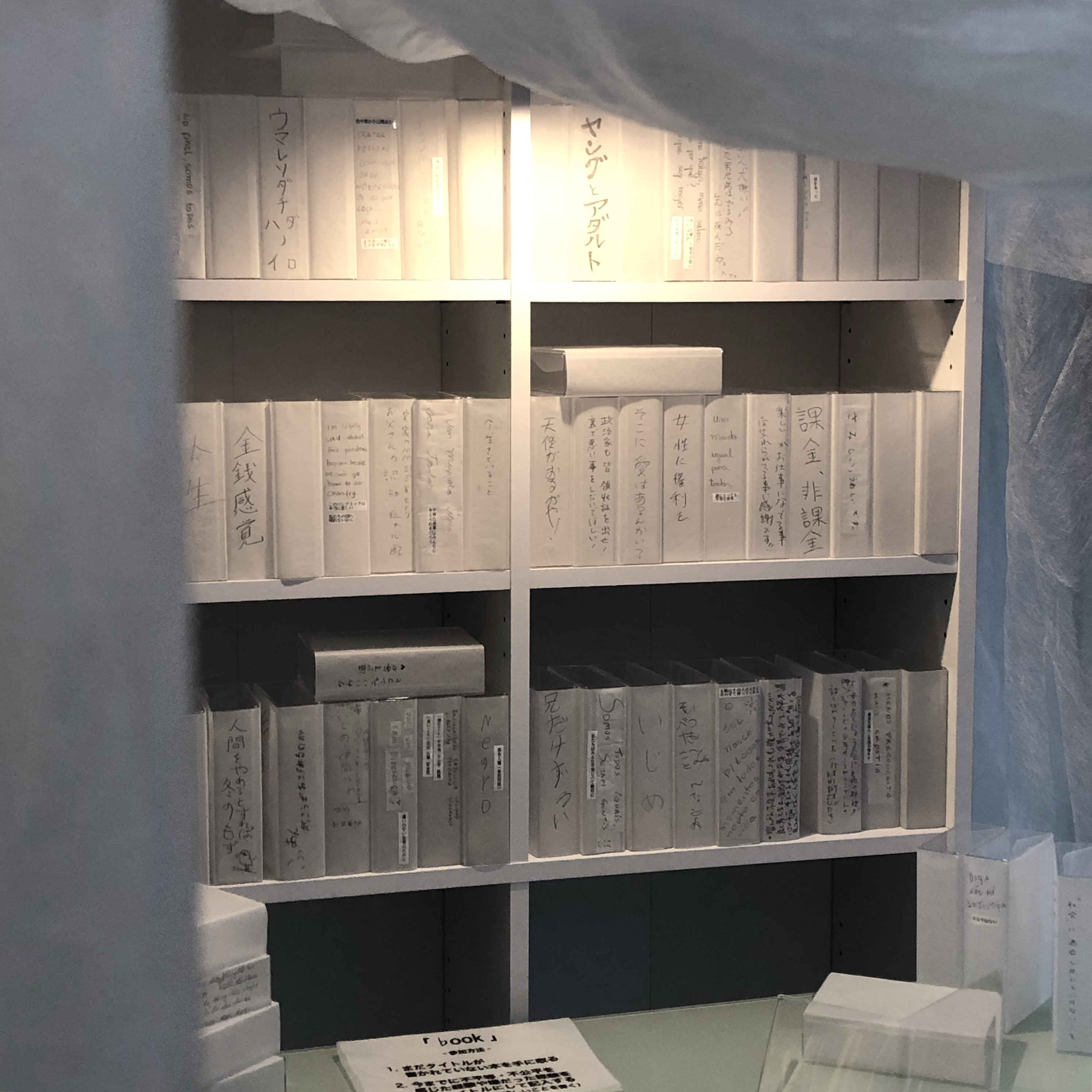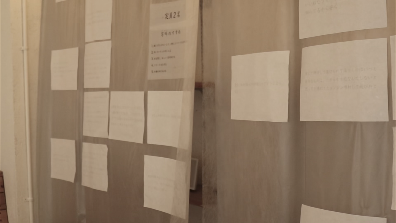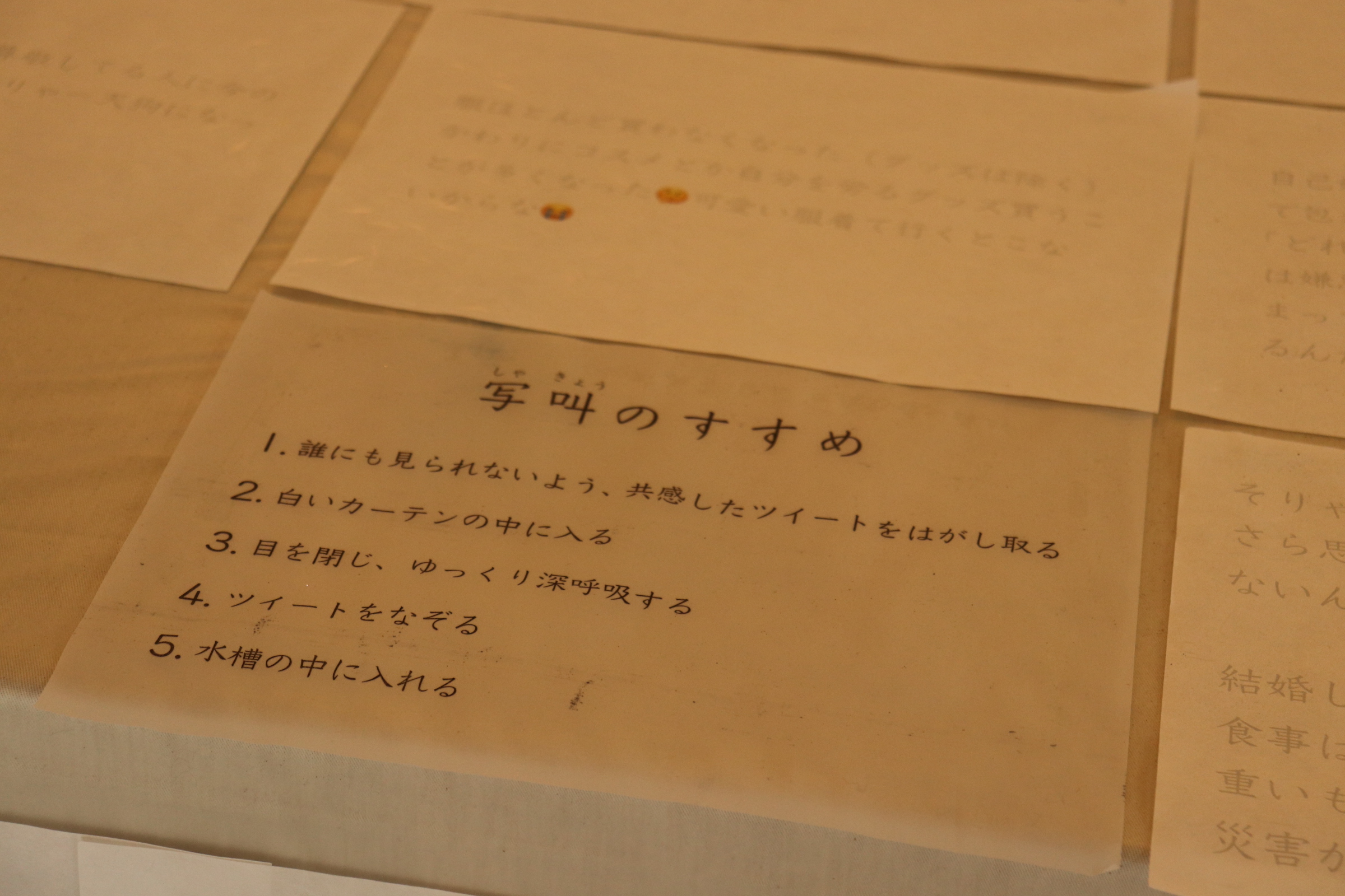 空間に入ると叫び声が聞こえ 懺悔の部屋のようになっている。「自分」という言葉を含んだツイートが壁一面に貼られている。この中から共感したものを手に取り ツイートの文字を写経のようになぞる。