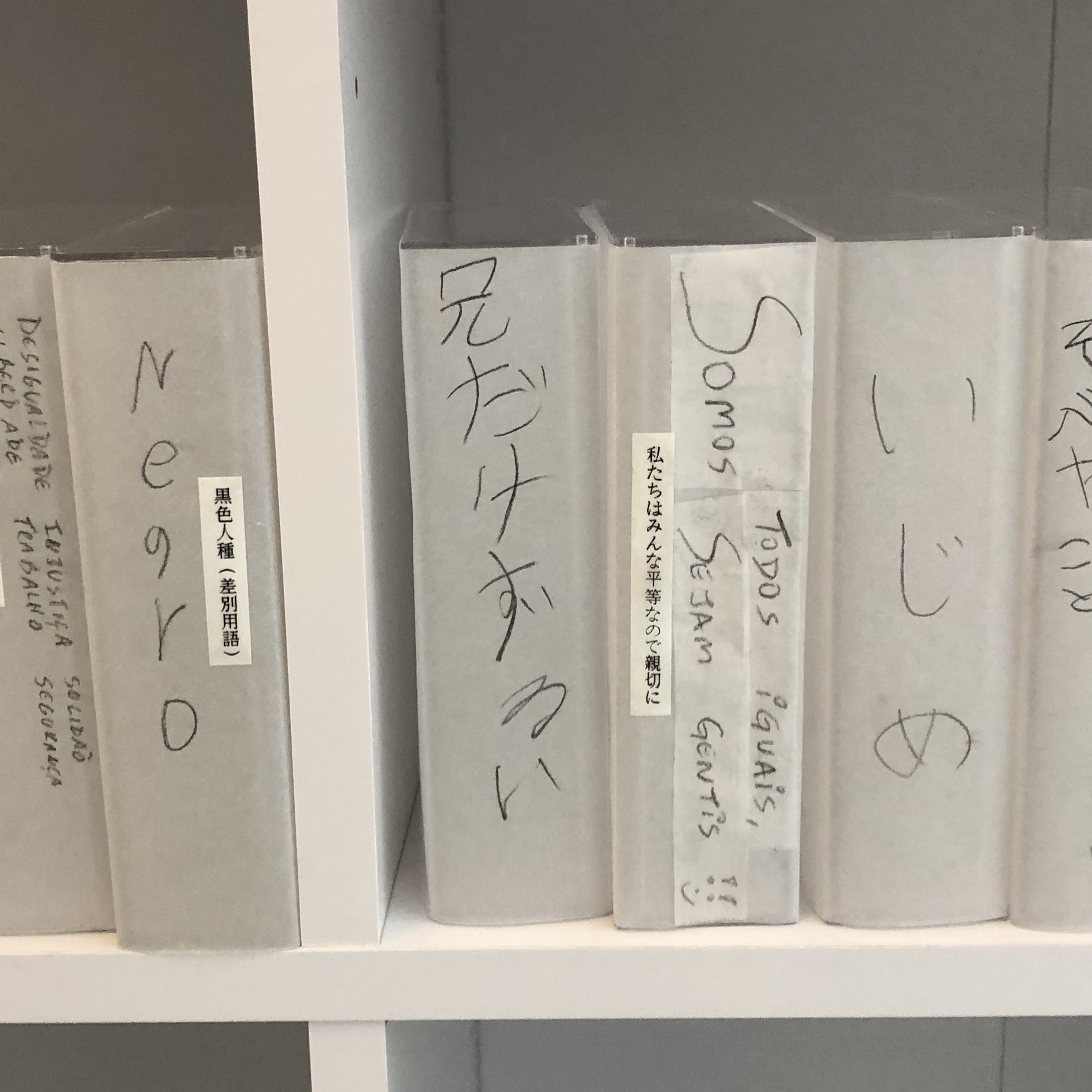 豊田市には、いろんな言語の方が住んでいて、私や私の家族と同じような境遇の方が多くいます。奥の2つの棚に並べられている本は、豊田市に住む方に、「不平等・不公平に感じたこと」を、本のタイトルにして書いてもらったものです。いろんな言語で書かれていますが、日本語以外のものは、愛知県最大の外国人団地である「保見団地」で集めました。色々な人々の声を知り、共感し合うことは、心の距離を縮め、凹凸な社会をフラットにしてくれることを願っています。